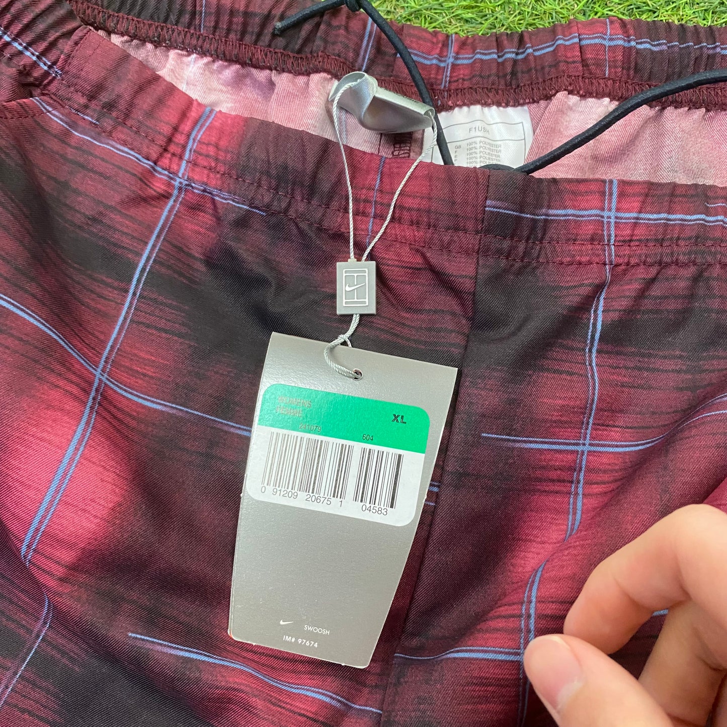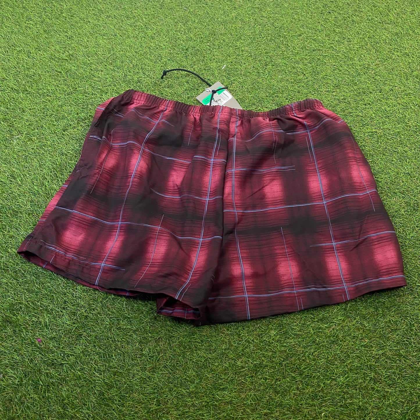 Vintage Nike Challenge Court Shorts Spell Out Logo Plaid Red. Deadstock with labels from the 90s still attached. Pockets and drawstring.